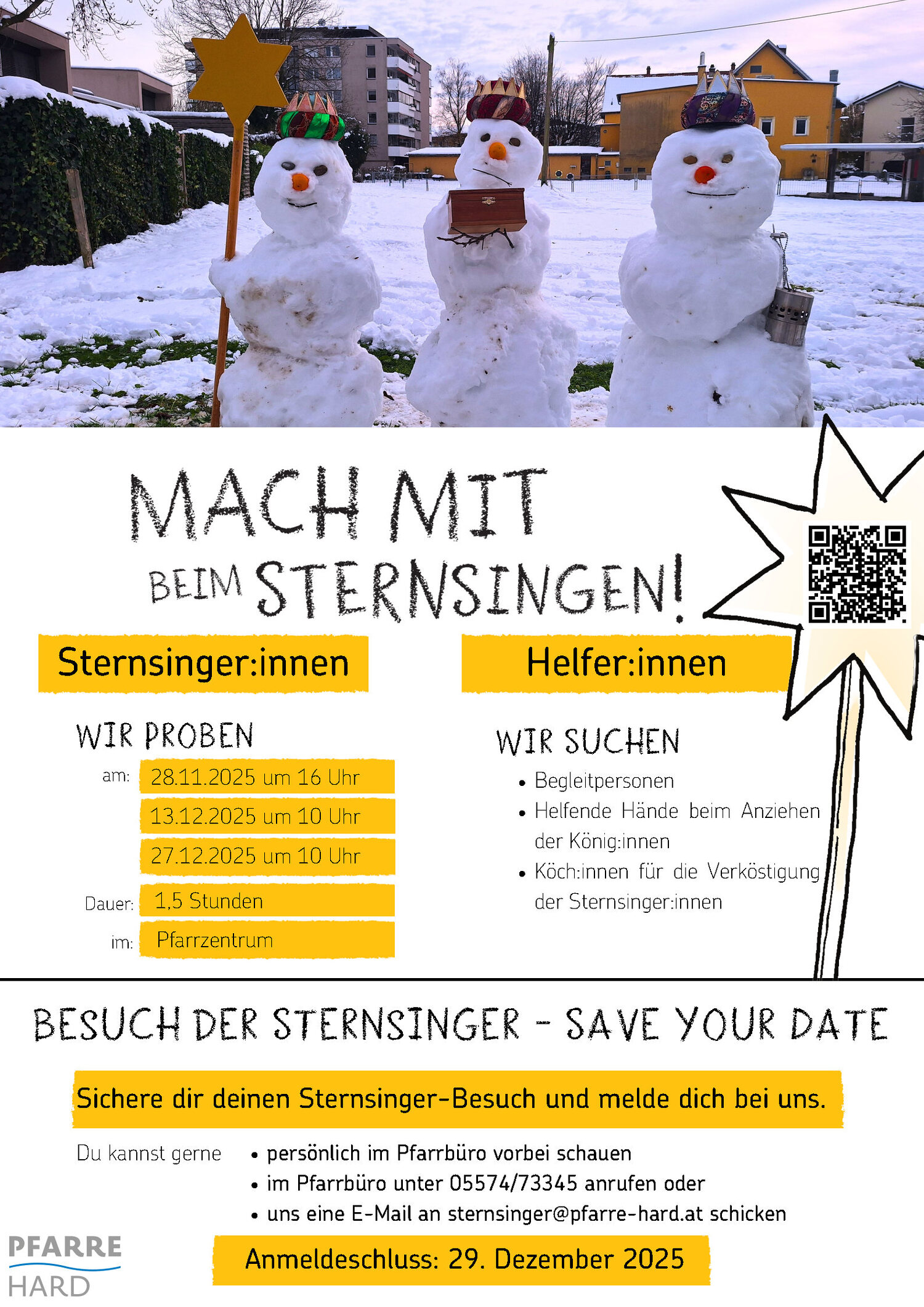 Wenn auch DU beim Sternsingen in Hard dabei sein möchtest, melde dich bei unserer Jugendkoordinatorin Sarina Hotz (sternsinger@pfarre-hard.at) oder im Pfarrbüro.